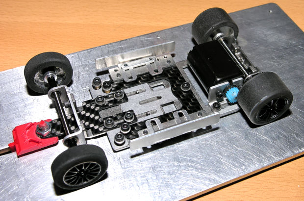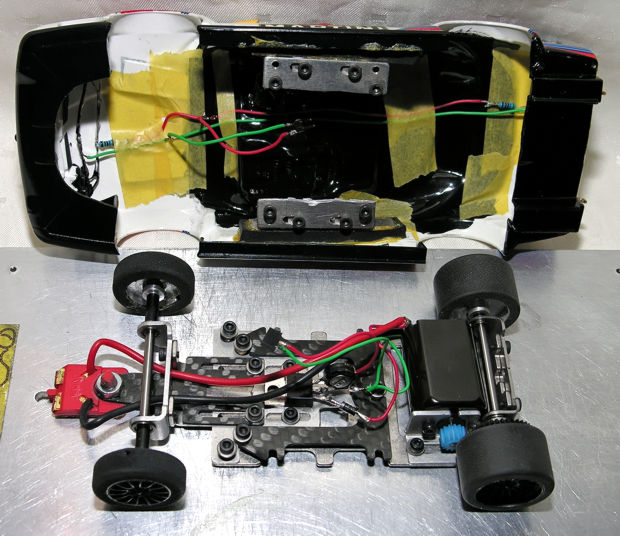 einigen Carbonteilen erleichtert. Die Räder stammen noch von dem Audi R10 den Michael "mk-slot" mir gebaut hat. Da ich diesen gleich auf Moosis umgerüstet hatte lagen diese solange im Tresor - hinten sind nämlich nicht mehr erhältliche alte Wiesel-Reifen drauf - pures Gold! |