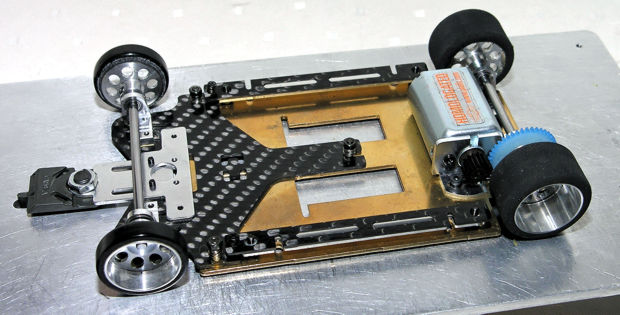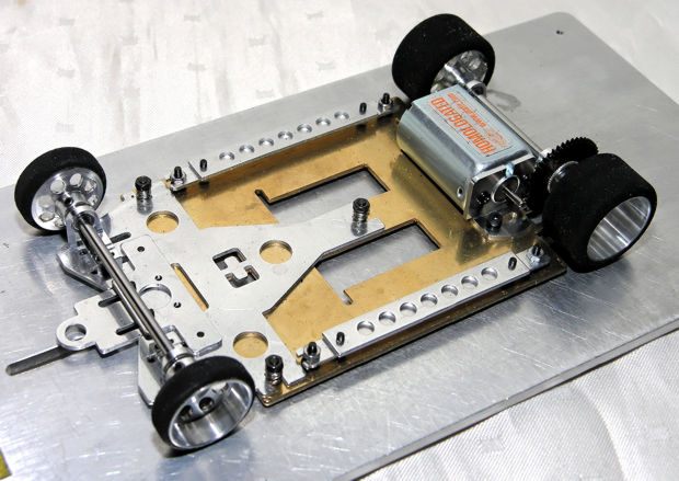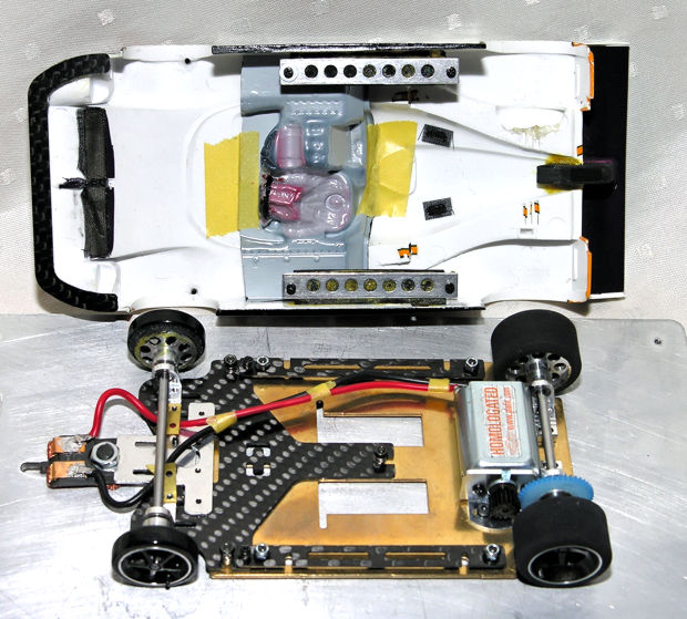 gegenüber dem Originalteil einen deutlichen Gewichtsvorteil hat. Auch das Plafit SLP2-Chassis ist angekommen und wurde montiert, die Reifen sind bereits fertig geschliffen. Auf dem Bild sind die Verklebehilfen montiert die später gegen die Karohalter ausgetauscht werden. Ich habe selten ein so paßgenaues und gut verarbeitetes Chassis erlebt - da bekommt man richtig Lust es endlich zu fahren. |