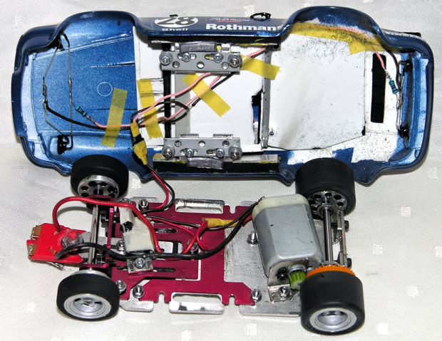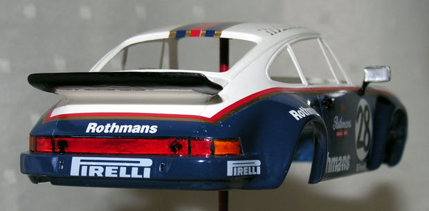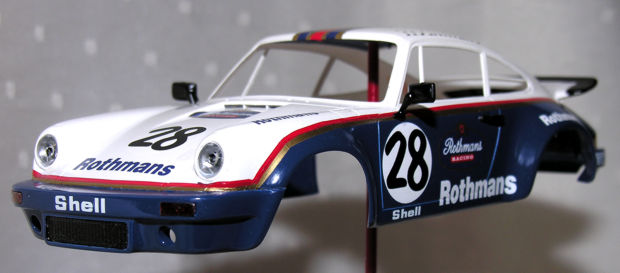 kommen ist noch ungewiß. Die Karosserie wurde auf jeden Fall schon mal zusamengeklebt, geschliffen und grundiert. Sie wird eine weiß-blaue Lackierung mit "Rothmans"-Outfit erhalten. |