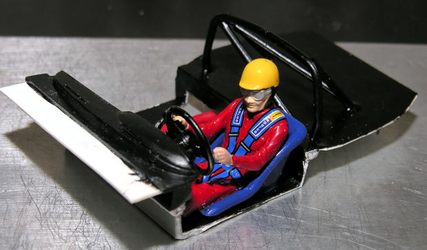 | Die Inneneinrichtung ist ebenfalls fertig, zwar spartanisch aber aus Original - Bausatzteilen. Da die Karosserie mindestens 60 Gramm wiegen muß wäre es sinnlos gewesen hier leichte Lexanteile zu verwenden. |