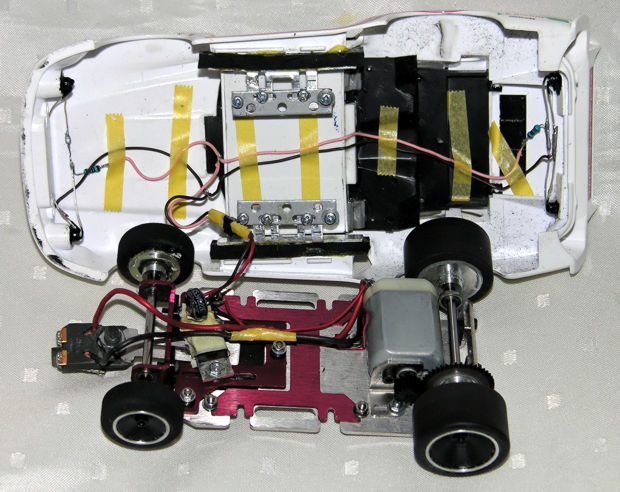 | Die "Hochzeit" zwischen Karosserie und Chassis klappte problemlos und so sieht das ganze jetzt aus. Leider hatte ich zuvor vergessen noch Bilder vom Innenraum zu machen. Diesen habe ich aus Originalteilen des Bausatzes sowie einer bearbeiteten Fahrerfigur gestaltet. Da die Karosserie dem Reglement entsprechend mindestens 60 Gramm wiegen muß war dies gewichtsmäßig kein Problem. |