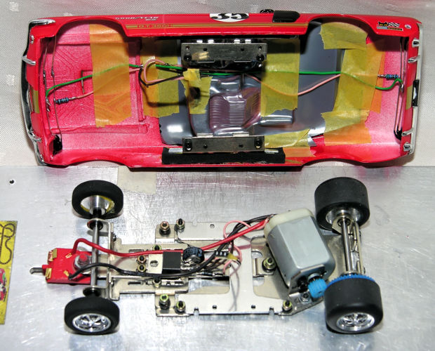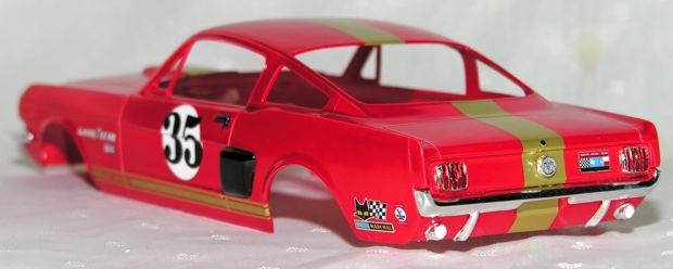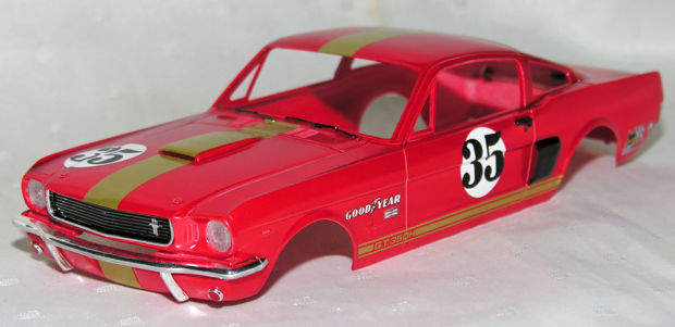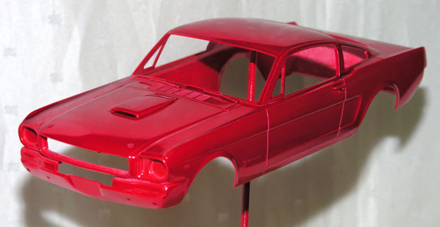 zusammengeklebt, gründlich ge- schliffen, grundiert und lackiert. Ich habe mich dabei für dieses tolle rotmetallic entschieden weil ich davon ausgehe, dass es wunderbar sowohl mit den Chromteilen als auch den goldenen Zierstreifen harmonisiert. Die Löcher für die obligatorische Beleuchtung kann ich erst später bohren weil zuvor noch einige Chromteile verklebt werden müssen. |